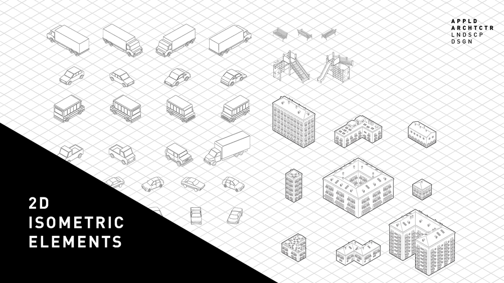 Over 30 unique 2D blocks including cars, buildings, and benches